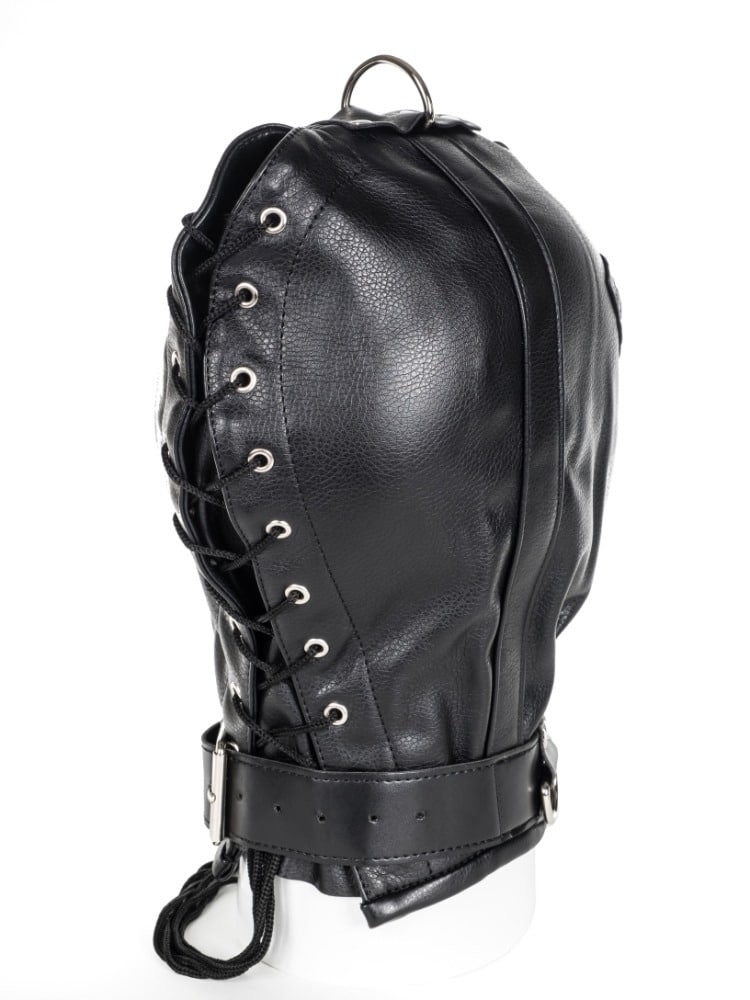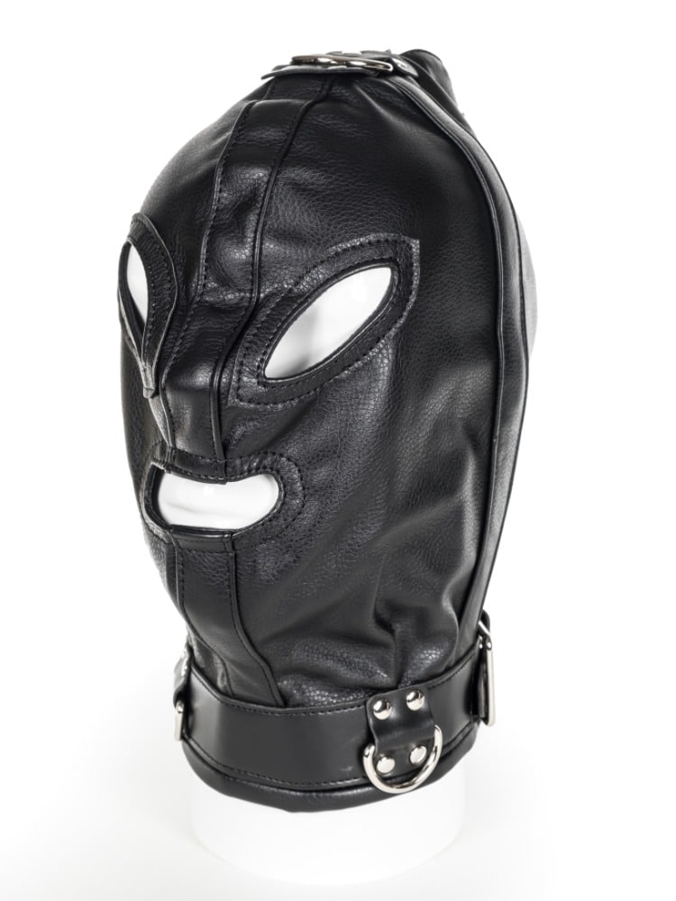 This black adjustable 3-Hole Hood with D-Rings caters to BDSM players of all experience levels, allowing your partner/sub/slave’s predicament to get more extreme one D-ring at a time.