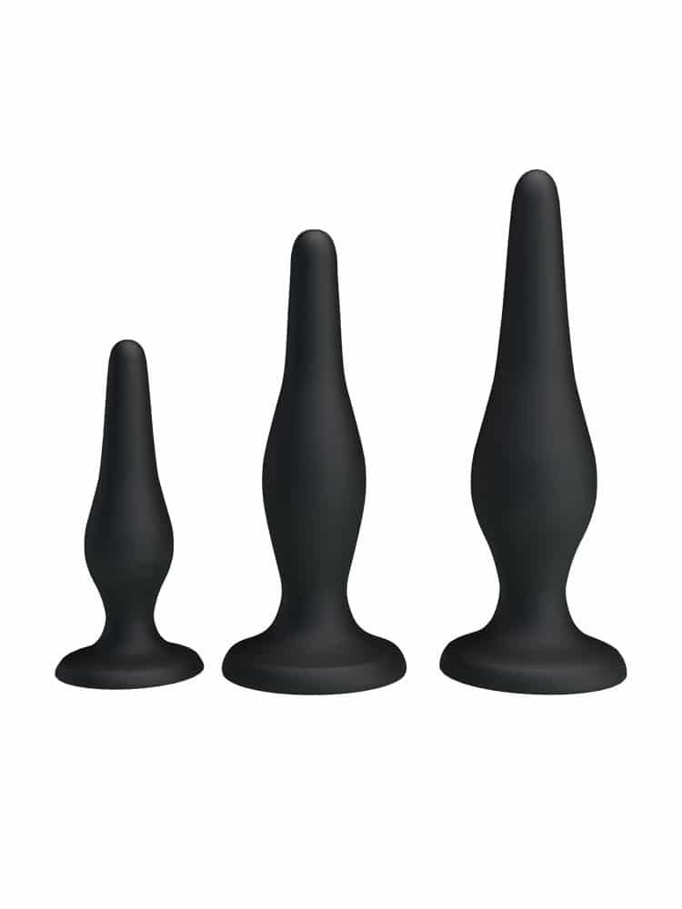 Consisting of 3 black butt plugs; 1 style in 3 different sizes: tiny, small and medium.