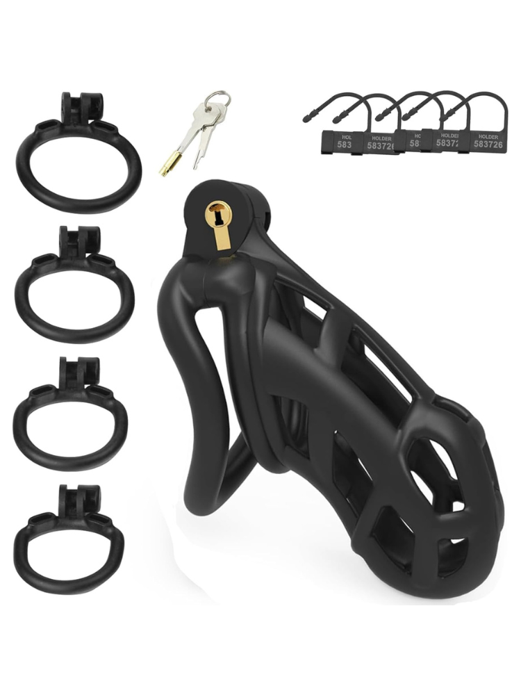 With multiple base ring sizes included, it’s easy to customise the fit. A traditional metal lock and key give you total physical authority, while numbered plastic tags offer travel-friendly security or discreet domming from a distance.