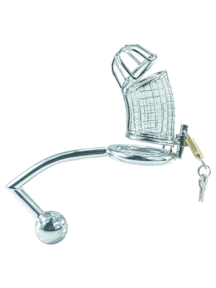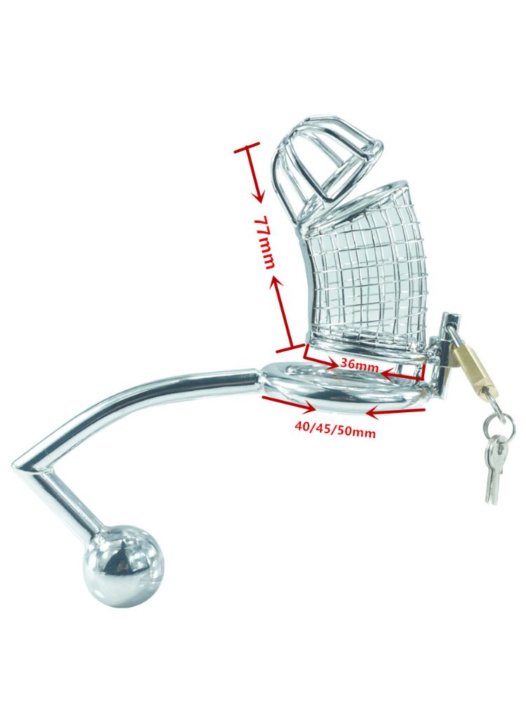 Ready to turn the key on total surrender? This stainless steel Cock Cage With Anal Plug offers a delicious mix of restraint, control, and intense internal stimulation for advanced players who crave complete submission. Crafted from durable, body-safe stainless steel, this cage is built to last—and built to tease. The breathable, open-grid design allows for hygiene and ventilation, while the contoured cage keeps him comfortably and securely locked up. The star of the show? A perfectly curved anal hook with a smooth weighted bulb, adding a constant, thrilling pressure that heightens the power dynamic with every movement.