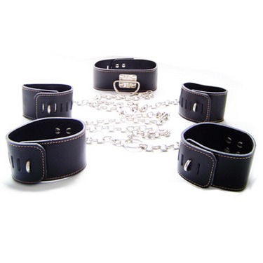 Complete Leather Restraint System (Collar, Wrist & Ankle Cuffs with interlinking Metal Chains)