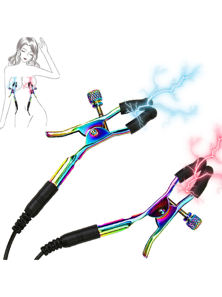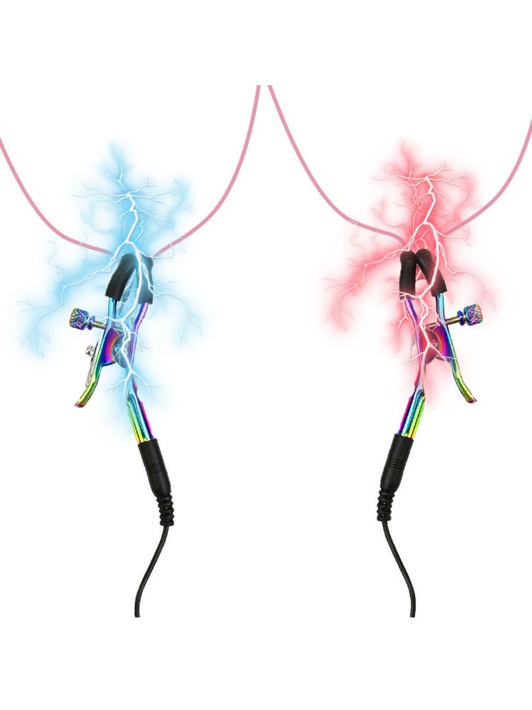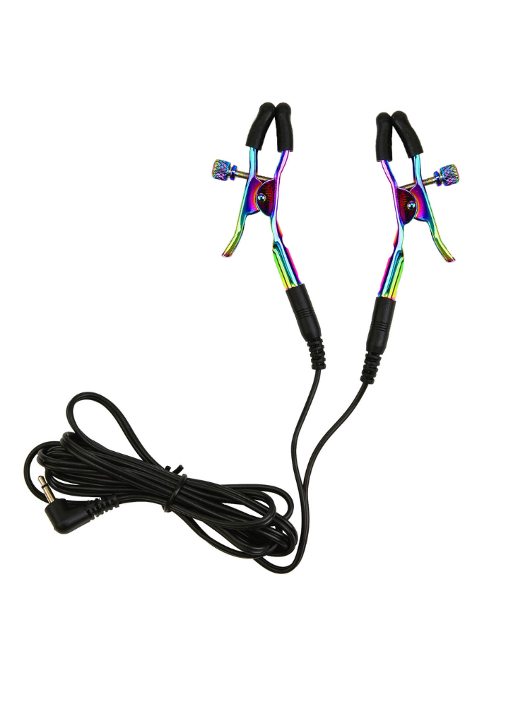 These Electro Nipple Clamps are here to bring your bondage and sensation scenes to life—literally. Designed for daring players and e-stim enthusiasts, these striking, rainbow-finished clamps deliver a delicious blend of pressure and pulsing stimulation directly to the nipples. Whether you’re looking for gentle tingles or full-on zaps, they’ll plug into your compatible electro box and deliver a charge that dances across your skin in exactly the way you crave.