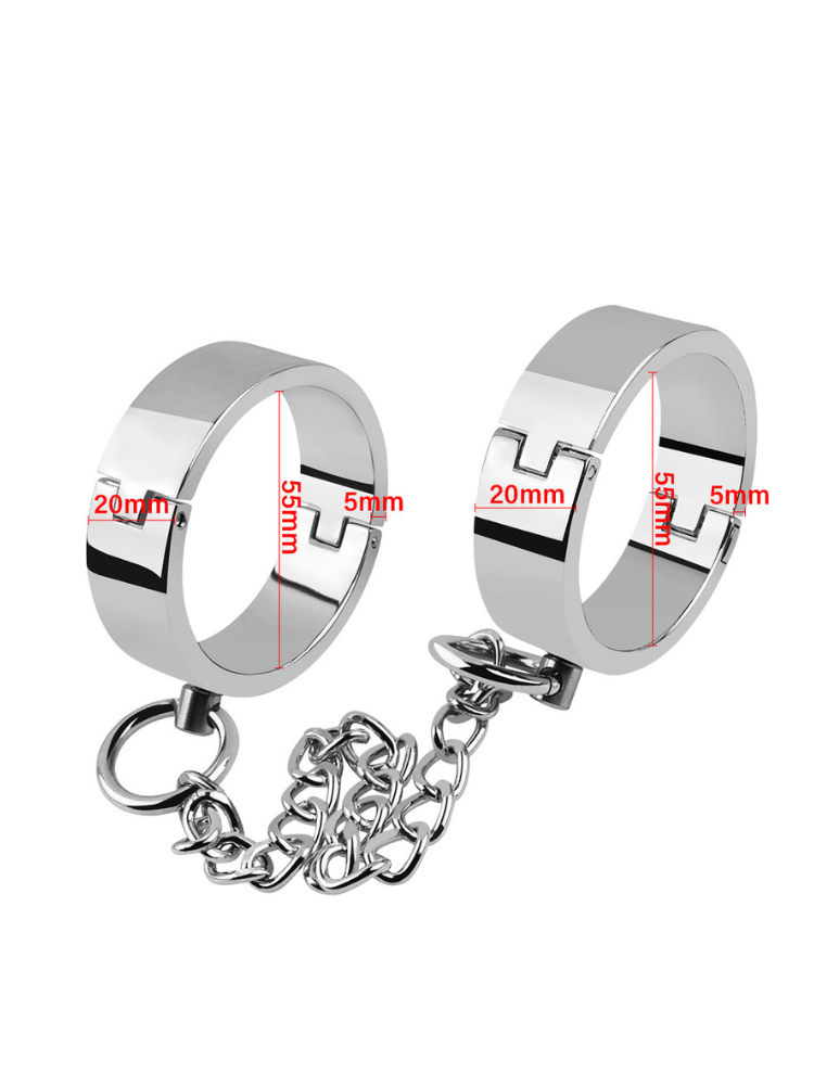 These Wide Female Bondage Cuffs are crafted to captivate—offering sleek restraint with a heavy-duty edge. Designed specifically to fit smaller wrists with a snug, secure feel, these female-sized cuffs are as functional as they are visually striking. The smooth, mirror-polished steel and bold geometric locking design scream authority, while the solid connecting chain ensures your submissive stays exactly where you want them. Perfect for D/s dynamics, public restraint, or dungeon-worthy scenes, these cuffs lock securely with hidden screw pins and hold firm through power play, posture correction, or objectification scenes. They’re wide, weighty, and utterly inescapable—yet comfortable enough for extended wear.