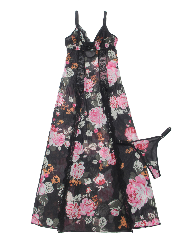 This stunning printed mesh nightgown brings a romantic twist to sultry seduction. Wrapped in bold florals over sheer black mesh, it teases just enough while leaving your confidence fully on display. Whether you’re walking into the bedroom or lounging in a little luxury, this long nightgown turns every moment into a runway. The plunging neckline is trimmed with scalloped lace to frame your curves, while the open-front skirt reveals daring side slits that playfully expose the leg. The soft mesh drapes lightly across your body, with a barely-there feel that’s breathable and endlessly touchable.