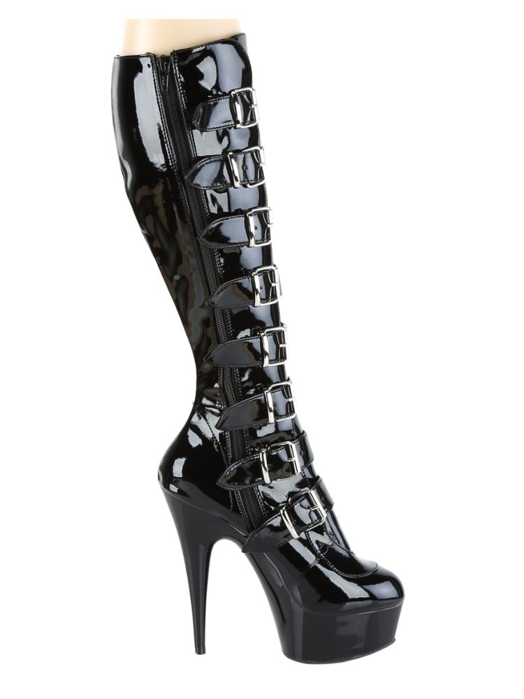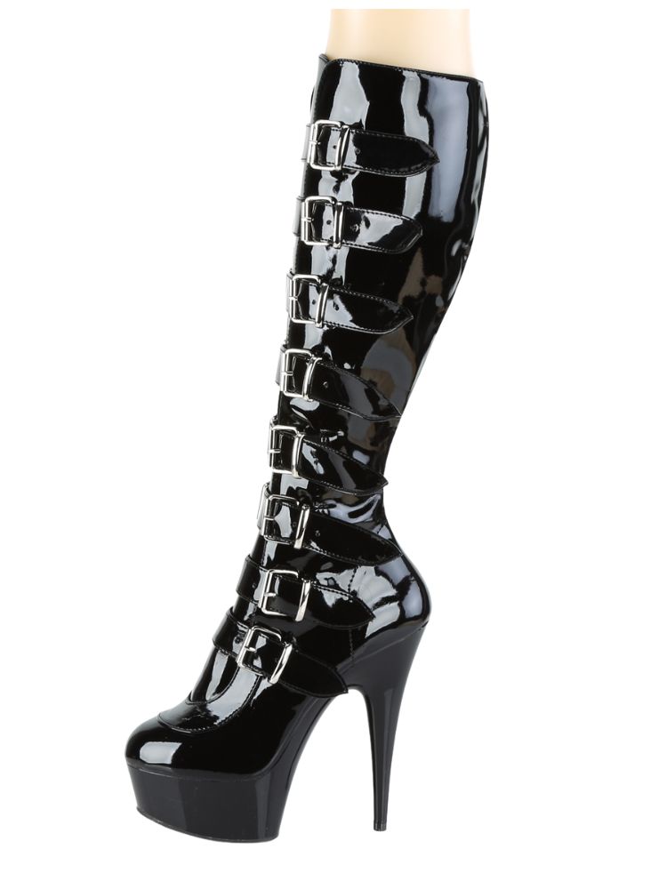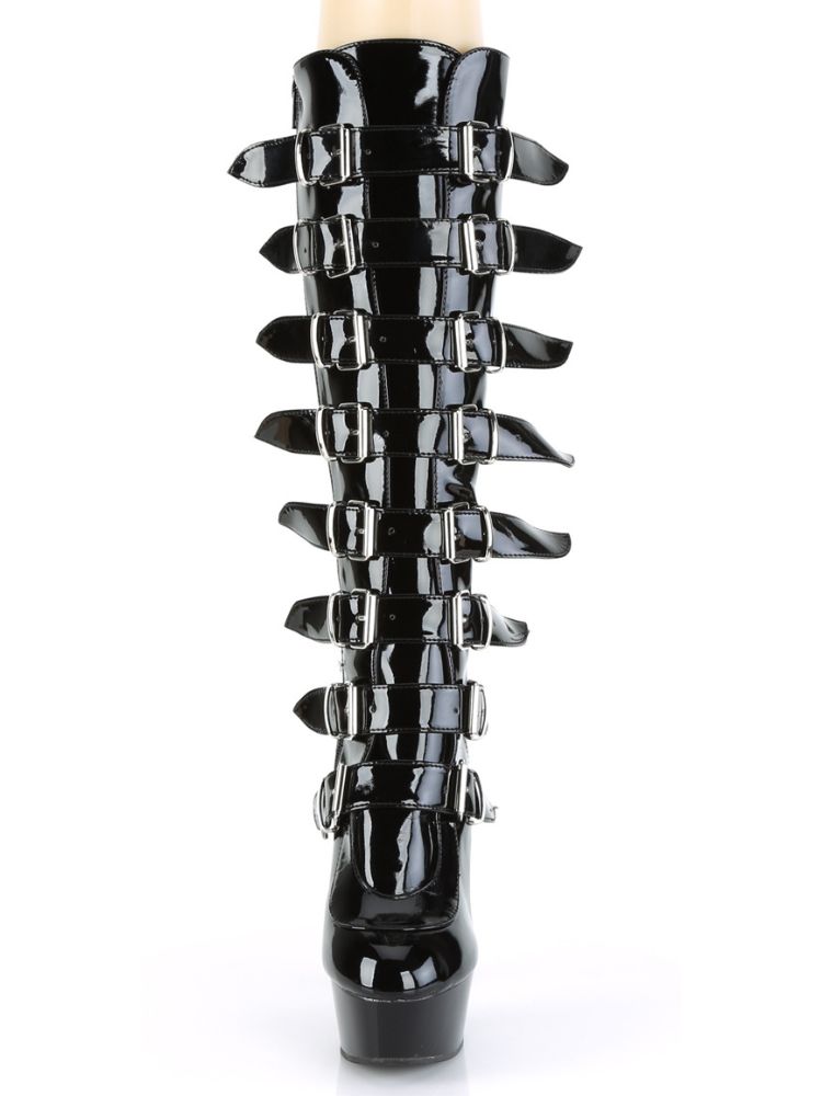 Dare to take your power play to new heights—literally. These fierce 6-inch stiletto platform boots are made to dominate every room (or dungeon) you step into. With an ultra-glossy patent black finish and an unapologetically bold row of gleaming buckles from toe to knee, they scream confidence and control.