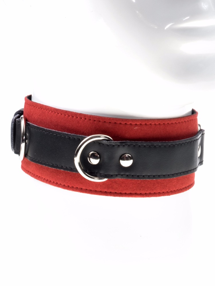 Made from genuine leather and suede, black leather lines the inside with red suede adorning the outside providing a backdrop for a black leather strap to run the entire length of the collar that secures to the collar by way of metal studs.