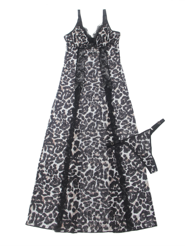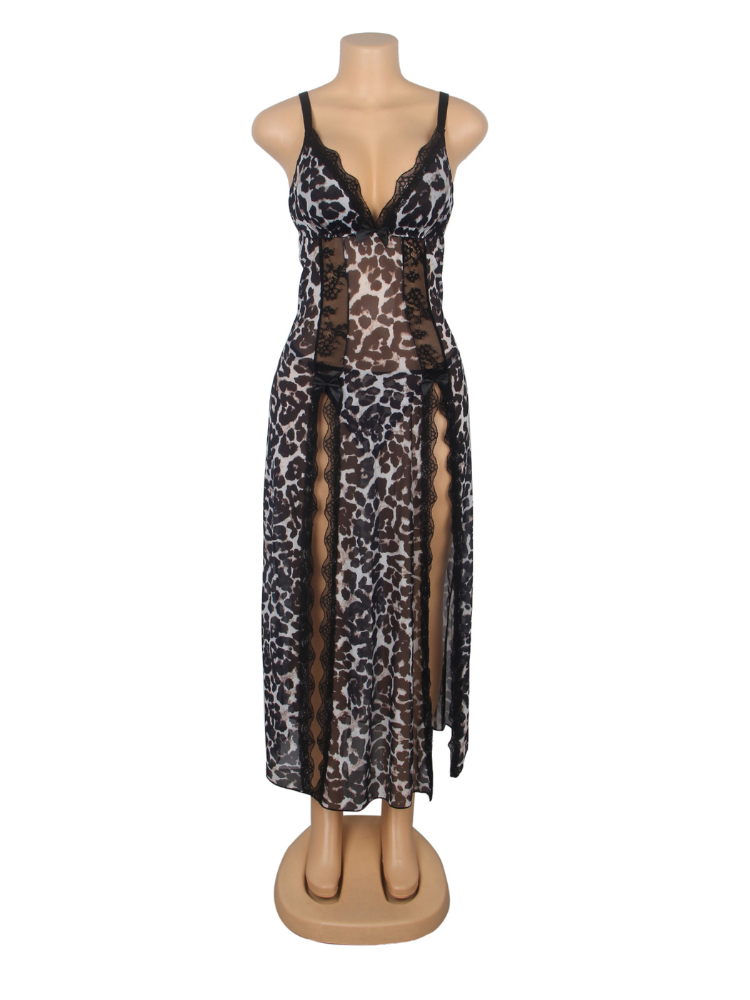 This sultry leopard print mesh nightgown is your go-to for making a fierce, unforgettable impression. Sheer, soft, and seductively daring, it hugs and flows in all the right places — with bold side slits trimmed in scalloped lace that draw the eye and dare the imagination. The plunging neckline is framed with delicate lace that flatters your bust, while adjustable straps and a secure back closure keep everything confidently in place. The sheer mesh fabric feels feather-light against the skin, offering a tantalizing peek while keeping you cool and comfortable.