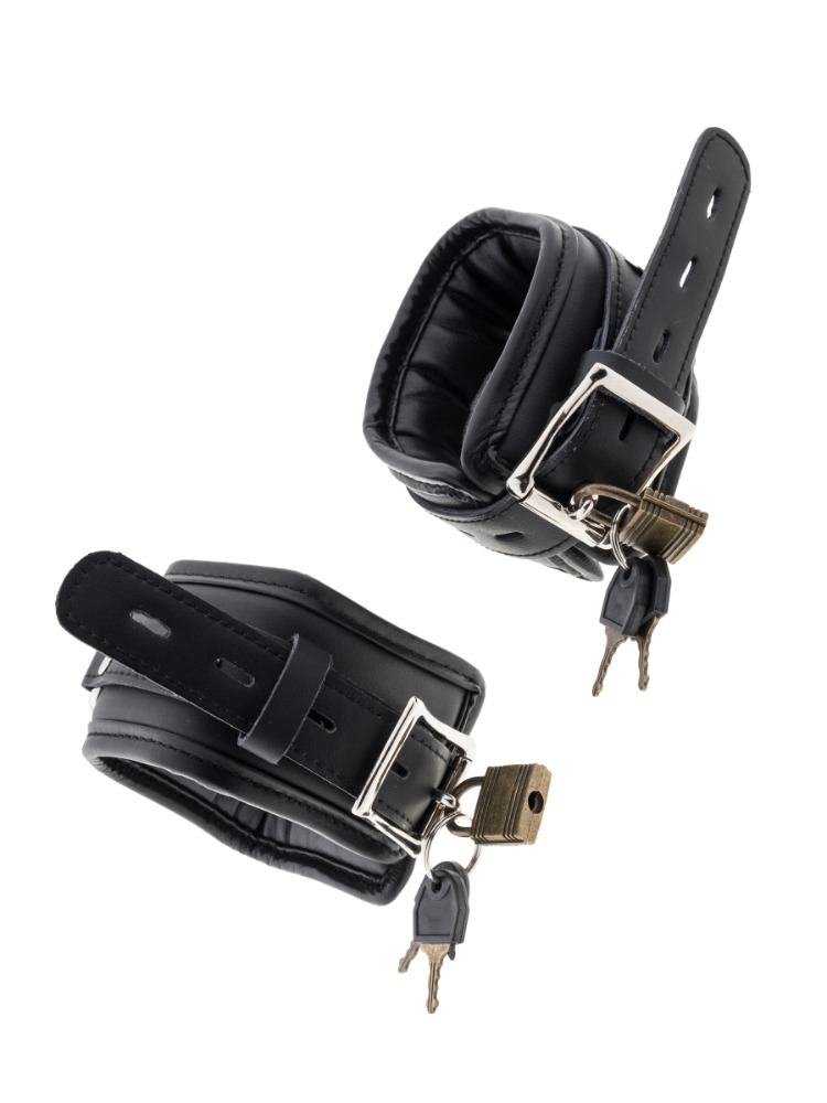 Made from genuine leather, the adjustable strapping becomes a central part of the cuffs aesthetic – blending into the main body of the cuff, black on black. This strapping runs the entire length of each cuff, secured to the cuff’s main body via metal studs that also keep the metal D-rings in place. The D-rings are not only what allows each cuff to be bound together (by way of padlock, supplied) but also opens up the possibilities of attaching more restraining equipment, should you ever wish to enhance the level of restraint your partner is subjected to.