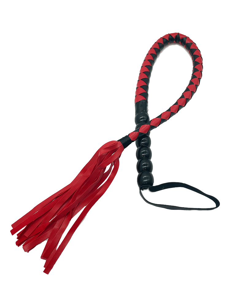 Red and Black Pleather Cross over Whip with Black Plastic Bubble Handle