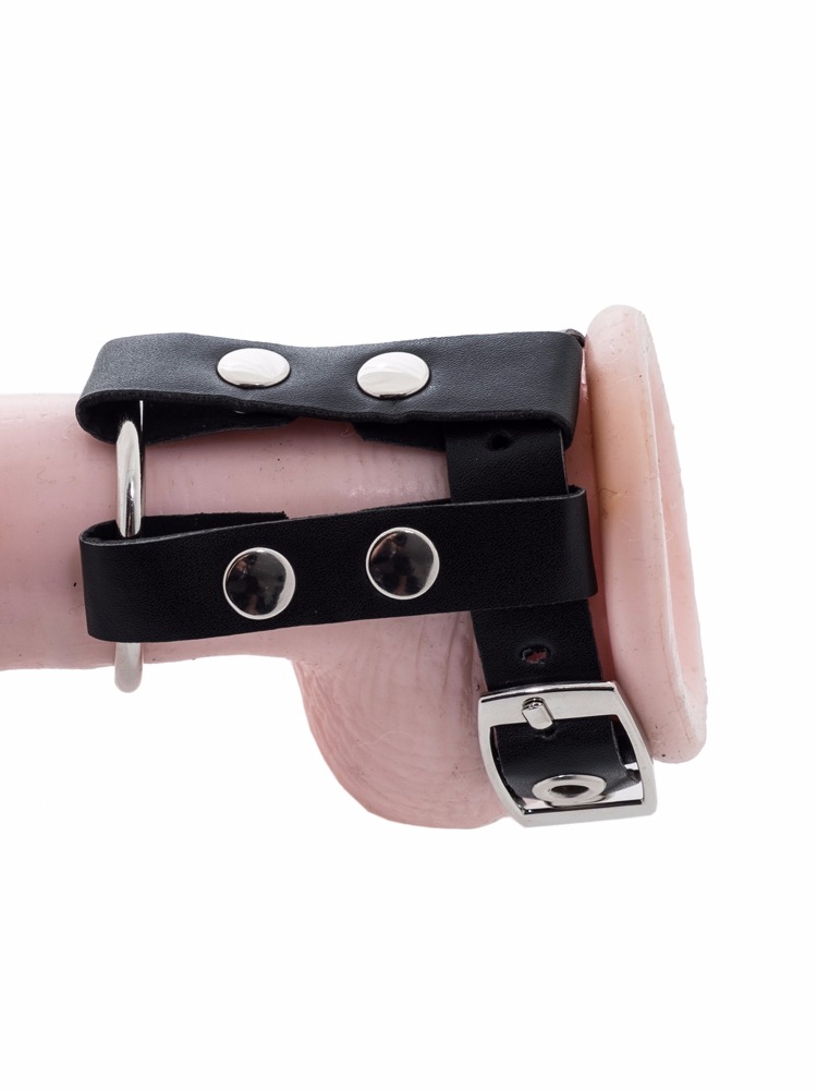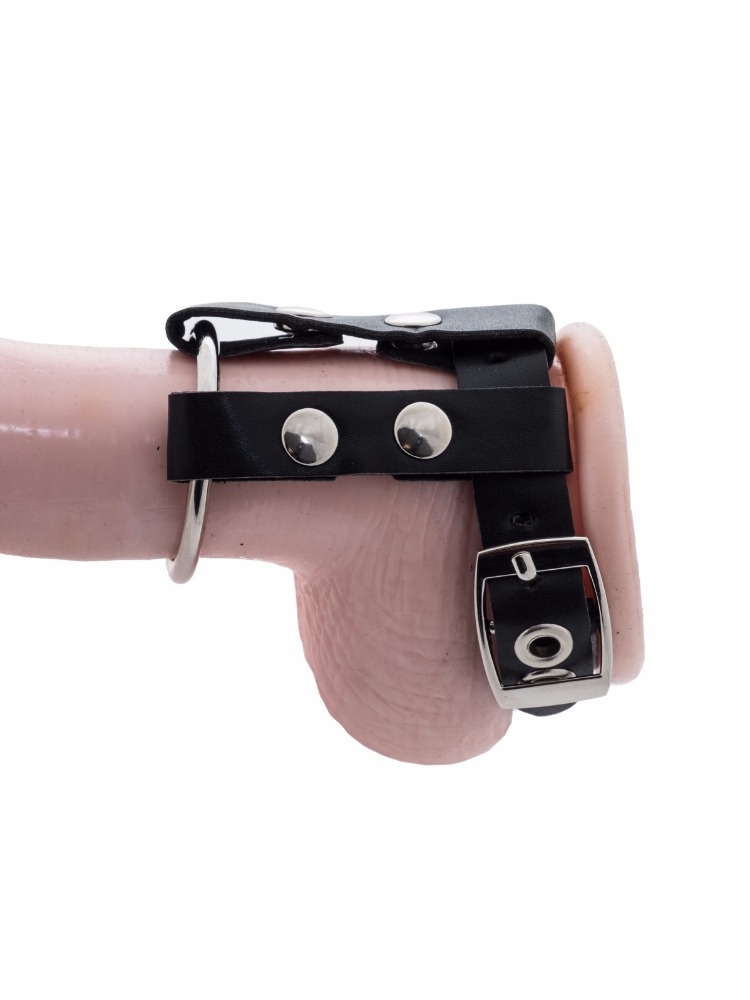 The cock ring is made from metal with the ball-ring and the two straps that travel along a small portion of the wearer’s shaft both being made from leatherette PVC.