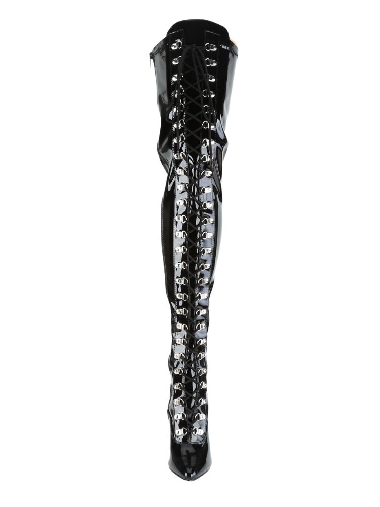 Black patent D-ring thigh high boots with 5-inch stiletto heels