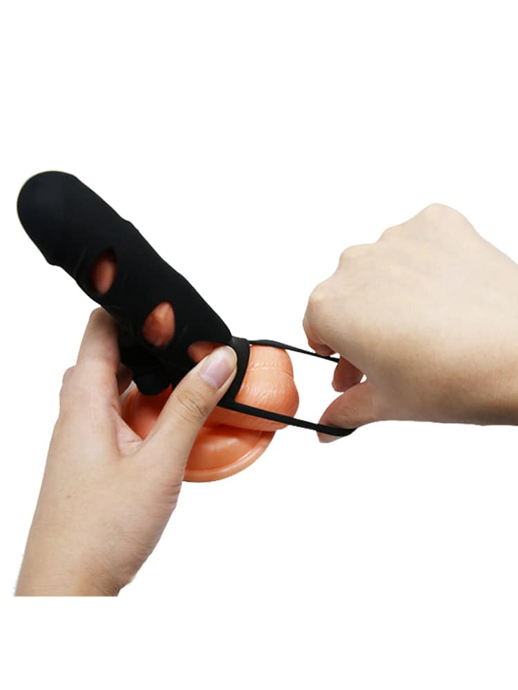 Made from silky smooth ultra-thin silicone, this penis sleeve is phallic shaped with sparse-but-slightly raised veins along its shaft (guaranteed to ‘tickle her fancy’ when lathered in lube). At the base of its shaft is a stretchy ball strap, to be worn just behind the balls this handy little feature stops the sleeve from annoyingly slipping down when the action heats up.