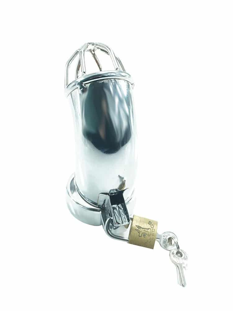 Confirming the wearer’s chaste-state, the enclosure attaches to the base ring, this prevents the wearer from simply yanking off the cage as it encircles both their penis and testicles, the testicles are pushed through the ring (with the ring nestling just behind the testicles).