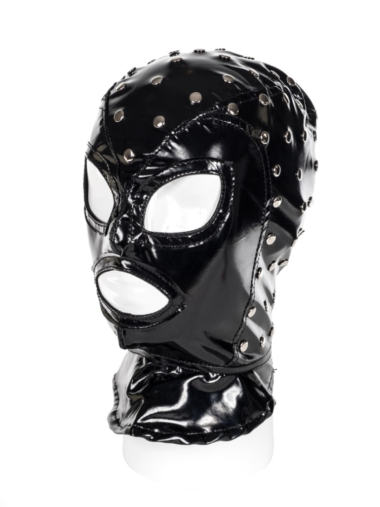 Made of PU (polyurethane), with an all-over sheen that will appeal to those who can’t get enough of that classic PVC look. Giving a dark edge (to an already dark hood) are metal studs, dotted all over the hood’s back, top, before tapering down to the nose.