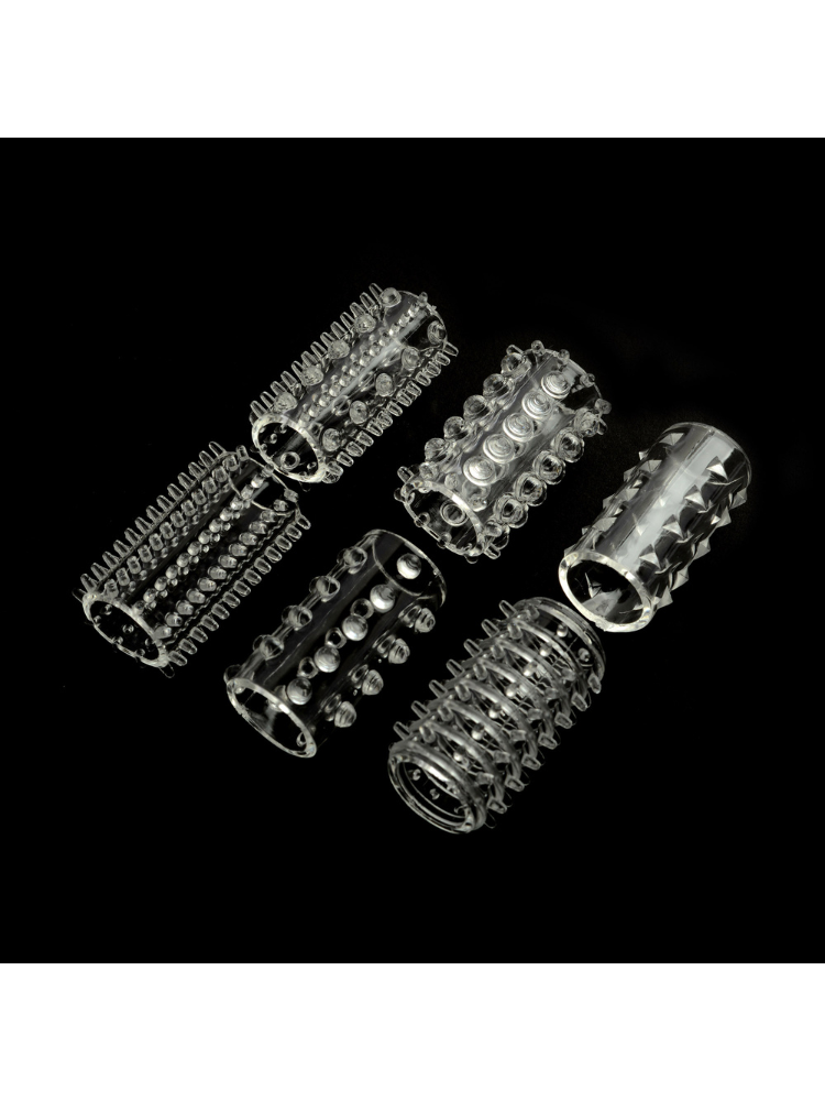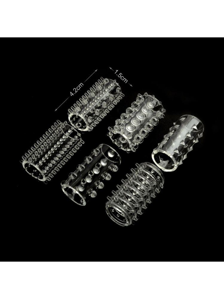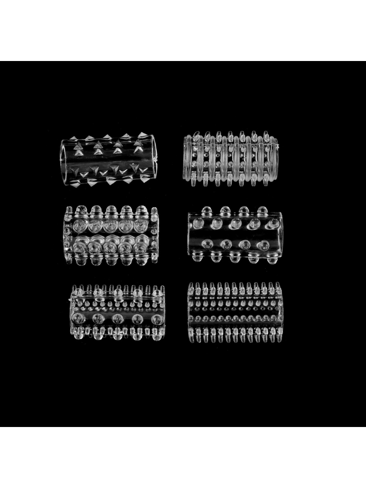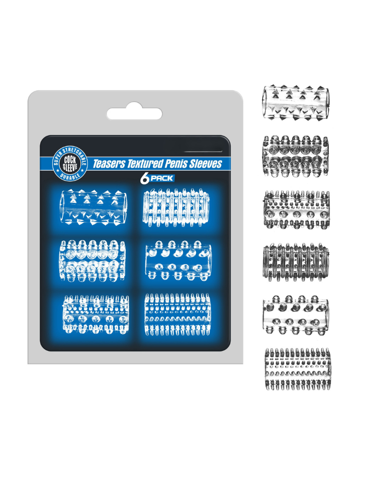 The Teasers Textured Penis Sleeves Set is your bedroom’s secret weapon — designed to enhance your erection, intensify your partner’s pleasure, and keep your sessions going longer and stronger. Inside this 6-pack, you’ll find a variety of ultra-stretchy, transparent sleeves, each with its own unique texture — from raised dots and nubs to tantalizing ridges and thrilling spikes. Slip one on to instantly add girth, grip, and a whole new level of stimulation to every move you make. Whether you’re looking to spice up foreplay, prolong the main event, or simply explore new sensations together, these sleeves are a no-pressure, no-commitment way to add instant excitement.