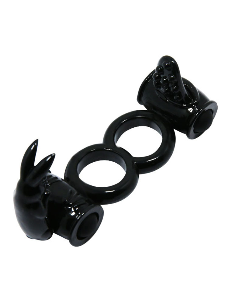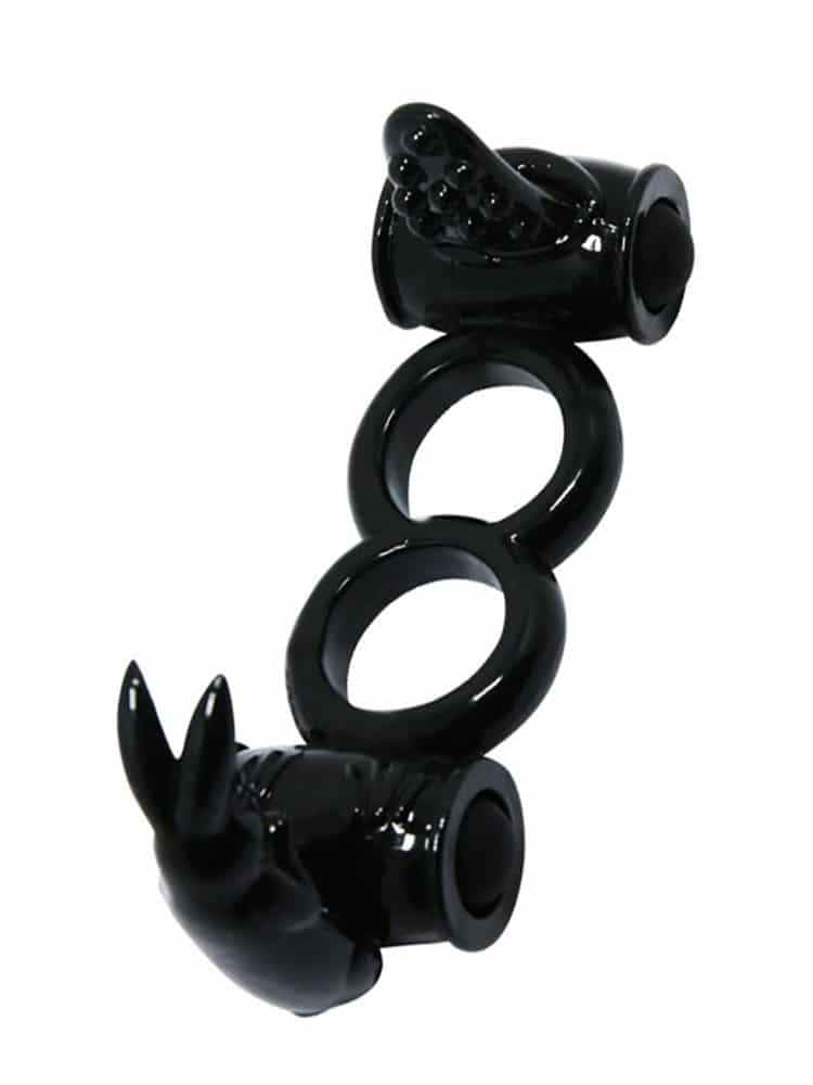 Between the rabbit ears and dotted-tongue are 2 cock rings, side by side. You don’t wear both rings at the same time, the idea here is the man wears the ring closest to whatever stimulator him and his partner plan to use. So if they’re opting for the rabbit ears, the man slips into the ring closest to the rabbit ears, then if they want to try the dotted-tongue ? you get the idea.
