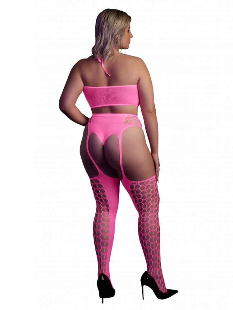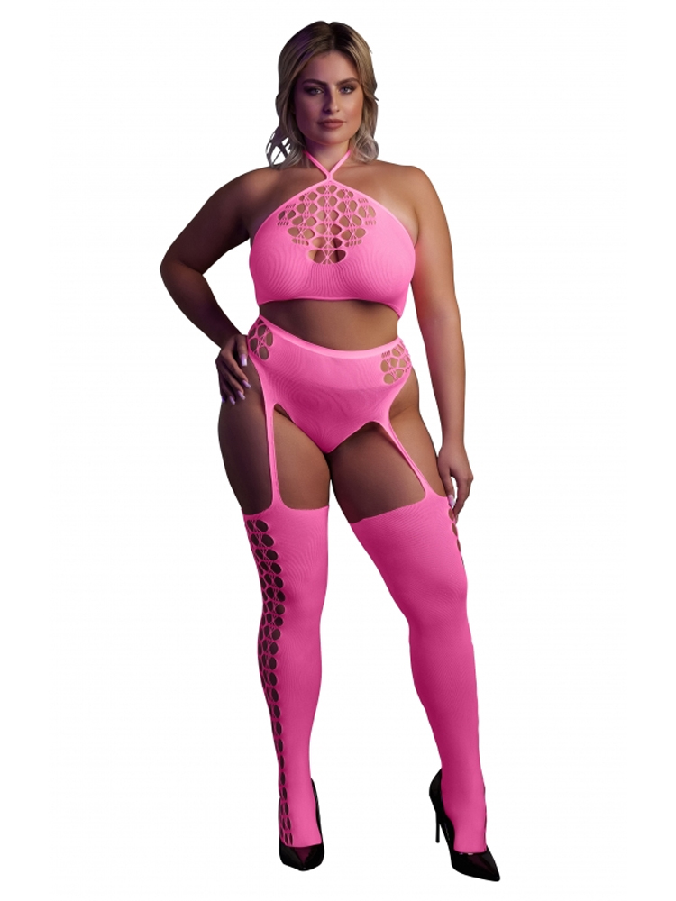 Glow In The Dark Neon Pink Crop Top & Garter Belt Stockings